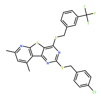 4-[(4-Chlorophenyl)methylsulfanyl]-11,13-dimethyl-6-[[3-(trifluoromethyl)phenyl]methylsulfanyl]-8-thia-3,5,10-triazatricyclo[7.4.0.02,7]trideca-1(9),2(7),3,5,10,12-hexaene 95%